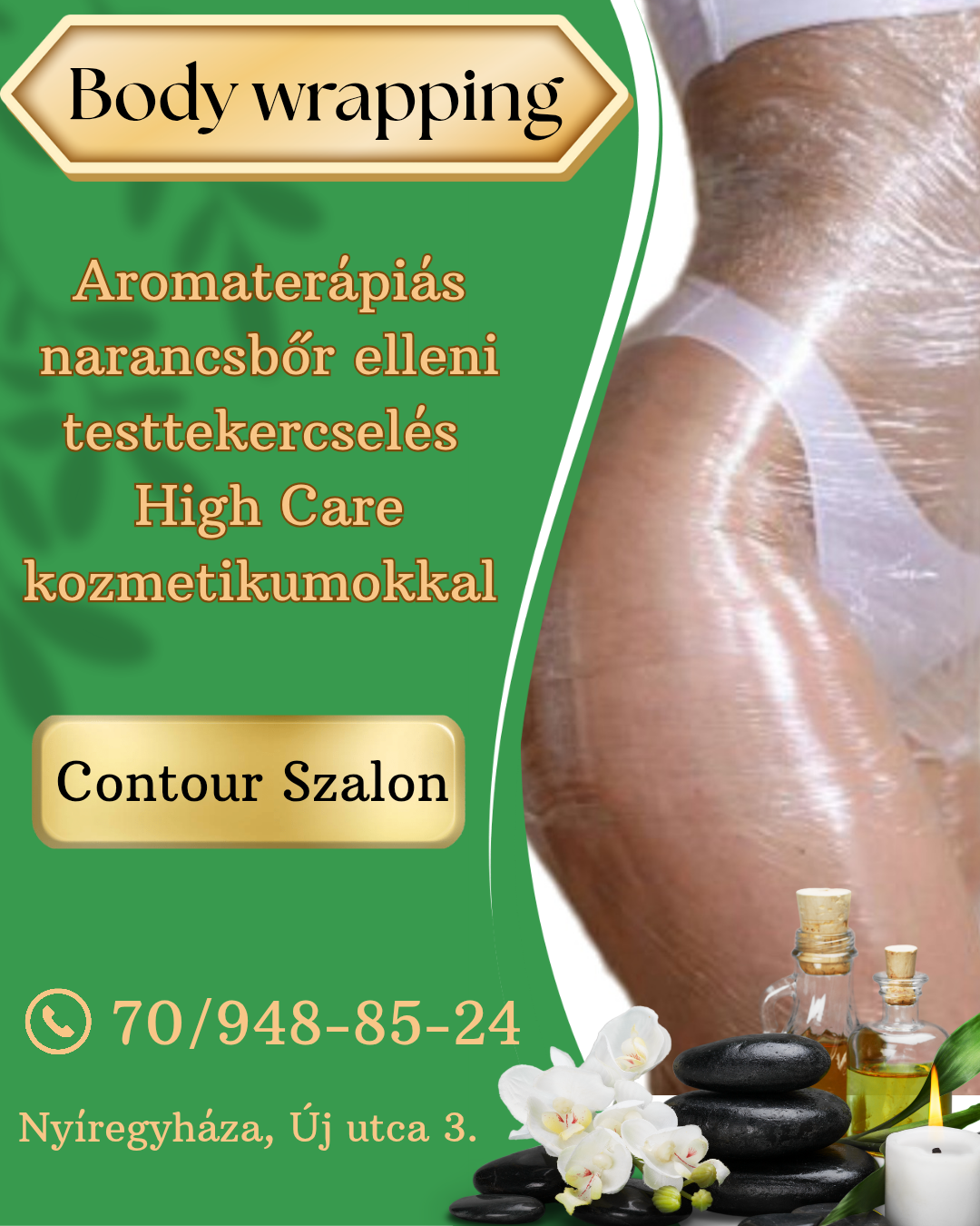 Body wrapping aromaterápiás narancsbőr elleni testtekercselés High Care kozmetikumokkal: